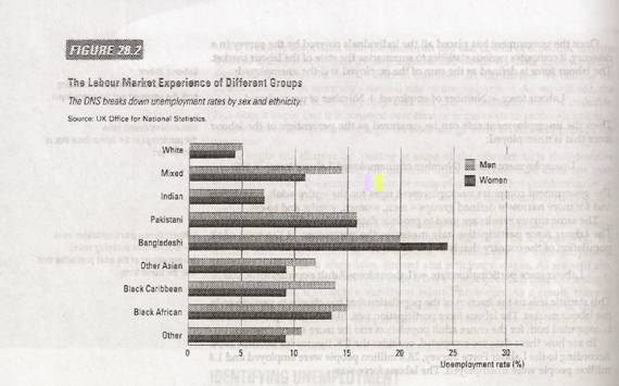 Figure 2 shows some statistics on UK unemployment for various groups within the population, broken down by ethnicity and sex, also collected by the ONS. A number of points are worth noting. First тАУ and perhaps most striking тАУ unemployment rates for people from non-white ethnic groups were higher than those for white people, for both men and women. Secondly, unemployment rates among ethnic groups vary widely. In 2001-02, among men, Bangladeshis had a highest unemployment rate in the UK at 20 per cent тАУ four times that for white British men. The unemployment rate among Indian men was only slightly higher than that for white British men, 7 per cent compared with 5 per cent. Unemployment rates for all other non-white men were between two and three times higher than those for white British men.