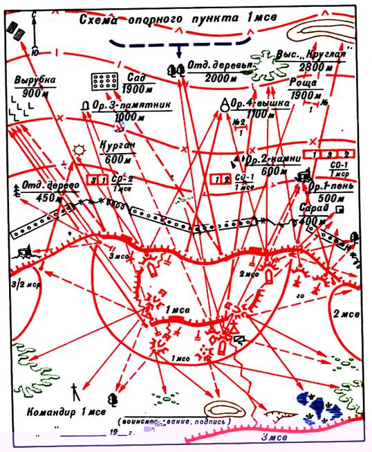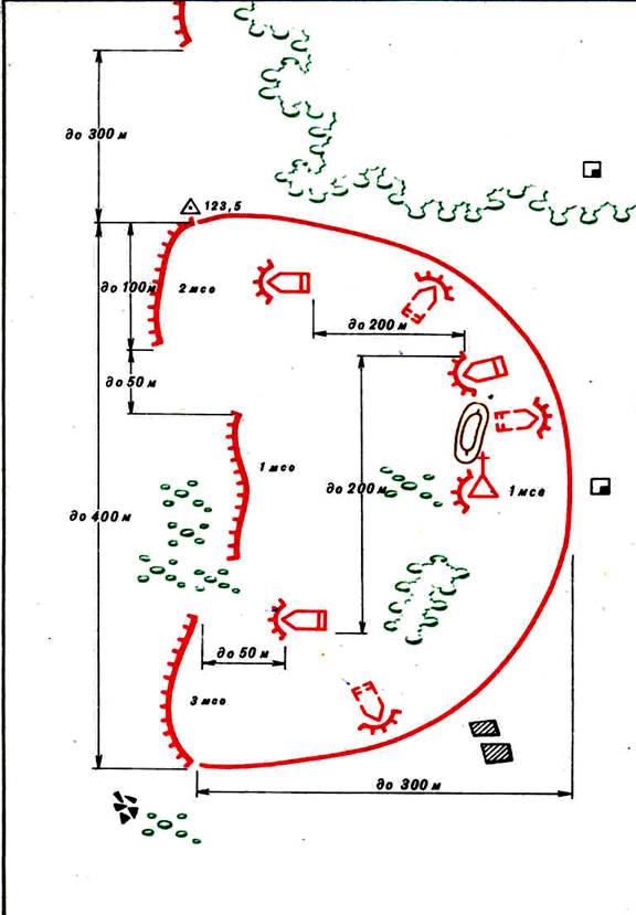 углом назад, иметь уступное и другое расположение, которое обеспечивает наилучшую организацию системы огня перед фронтом и на флангах опорного пункта. Приданные мотострелковому батальону танковые подразделения обычно пере подчиняются ротам и занимают оборону в опорных пунктах взводов.
