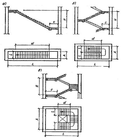Рис. 1. Схемы лестниц: а тАУ одномаршевая; б тАУ двух маршевая; в тАУ трехмаршевая; I тАУ ширина марша; с тАУ ширина лестничной площадки; А тАУ ширина лестничной клетки; L тАУ длина лестничной клетки: Н тАУ высота этажа; d тАУ длина марша (в горизонтальной проекции)