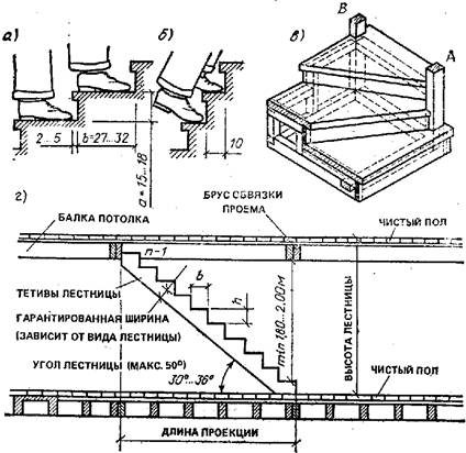 Рис. 2. Фрагменты ступеней: а тАУ высота и ширина нормальной ступени; б тАУ ширина узкого конца ступени винтовой лестницы; в тАУ фрагмент винтовой лестницы; г тАУ разрез лестницы
