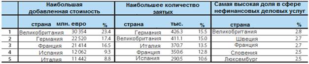 На Великобританию приходится самая большая доля в формировании добавленной стоимости (23,4%) в секторе инженерно-консультационных услуг из стран ЕС-27, Германия занимает вторую позицию (17,4%). Тем не менее, ФРГ создало больше рабочих мест в отрасли (15,5%), чем Великобритания (15%). Хуже всего рынок инжиниринговых услуг представлен в Болгарии, в которой доля добавленной стоимости предоставленных услуг не превысила 1%. Немногим лучше проявили себя Польша, Кипр, Словакия, Португалия и Латвия, вклад этих стран был ниже 1,5% (табл.