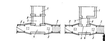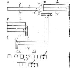 Рисунок 1. Планировочные схемы быстровозводимых убежищ а тАУ однопролётные; б тАУ двухпролётные; в тАУ трёхпролётные; г тАУ коленчатые; l тАУ помещения для укрываемых; 2 тАУ пандус, 3 тАУ предтамбур, 4 тАУ лестничный спуск; 5 тАУ тамбур; 6 тАУ внутренние рамы с распорками
