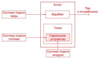 1. трубопроводами топлива, питательной воды и пара; 2. электрофицированной арматурой, исполнительными механизмами и эл. двигателями (далее везде ИМ); 3. датчиками и приборами контроля теплотехнических параметров ИМ, датчики и приборы контроля теплотехнических параметров образуют согласно функциональной принадлежности и пространственного расположения, следующие технологические (функциональные) подсистемы котла:
