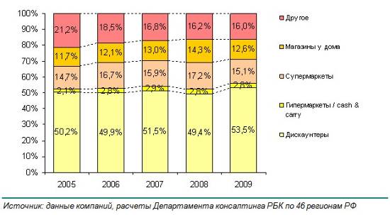 Согласно анализу, проведённому Департаментом консалтинга РБК по 46 регионам РФ, доля современных форматов сетевой торговли с 2005 по 2009 год менялась следующим образом (см. рисунок 1):