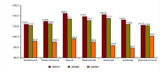 Процессы, происходившие в целом в сфере розничной торговли, были характерны и для субъектов Российской Федерации, но в каждом субъекте имеется своя специфика. Оборот розничной торговли в 2009г. по сравнению с 2008г. уменьшился во всех федеральных округах, кроме Дальневосточного федерального округа (см. рисунок 3).