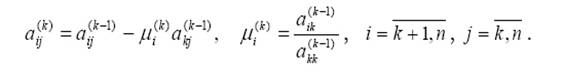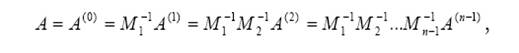 LU тАУ разложение может быть построено с использованием описанного выше метода Гаусса. Рассмотрим k - ый шаг метода Гаусса, на котором осуществляется обнуление поддиагональных элементов k - го столбца матрицы. Как было описано выше, с этой целью используется следующая операция