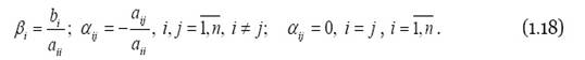 Разрешим систему относительно неизвестных при ненулевых диагональных элементах , aii≠0, i= 1,n (если какой-либо коэффициент на главной диагонали равен нулю, достаточно соответствующее уравнение поменять местами с любым другим уравнением). Получим следующие выражения для компонентов вектора β и матрицы α эквивалентной системы: