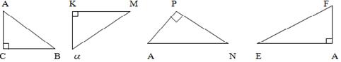 , как отношение сторон этого треугольника. Предварительно учащиеся должны усвоить названия сторон прямоугольного треугольника: катеты (стороны прямого угла) и гипотенуза (сторона противолежащая прямому углу). Для этого необходимо предложить учащимся прямоугольные треугольники, разнообразные по расположению вершин прямого угла и предложить назвать стороны треугольника.