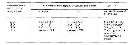 Преподаватель оценивает знания и выставляет по одному баллу за правильный ответ на вопрос и по одному баллу за правильное решение частей задачи (например, задачи ставятся таким образом, что необходимо найти ответы на четыре условия), т. е. максимально за одно занятие можно набрать 6 баллов за ответы на контрольные вопросы и 4 балла за решение задачи, итого 10 баллов.