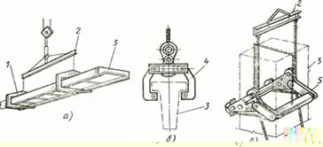 атАФподхватами снизу, б тАФ за выступающие части клещевым захватом, в тАФ фрикционным захватом; 1 тАФ консоли, 2 тАФ траверса, 3 тАФ конструкция, 4 тАФ элементы захвата, 5 тАФприжимы захвата