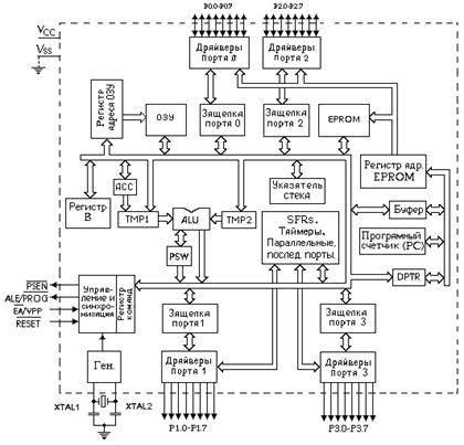 Устройство формирования временных интервалов предназначено для формирования и выдачи внутренних синхросигналов фаз, тактов и циклов. Количество машинных циклов определяет продолжительность выполнения команд. Практически все команды ОЭВМ выполняются за один или два машинных цикла, кроме команд умножения и деления, продолжительность выполнения которых составляет четыре машинных цикла. Обозначим частоту задающего генератора через Fг. Тогда длительность машинного цикла равна 12/Fг или составляет 12 периодов сигнала задающего генератора. Логика ввода - вывода предназначена для приема и выдачи сигналов, обеспечивающих обмен информации с внешними устройствами через порты ввода вывода Р0-Р3.