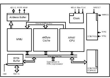 Общим для всех трех микропроцессоров является использование ядра ARM7, встроенного единого кэш команд и данных емкостью 8 Кбайт (ARM7100) и 4 Кбайт (ARM7500 и ARM7500FE), MMU, буфера записи, наличие режимов энергосбережения.