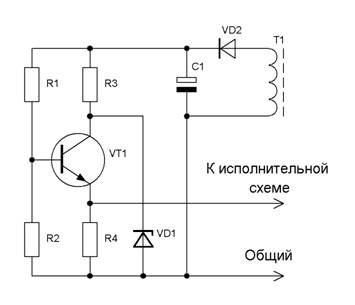 Пока автогенератор не вошел в нормальный режим, напряжение питания мало и транзистор VT1 закрыт. По мере увеличения напряжения питания на стабилитроне VD1 появляется образцовое напряжение, и затем транзистор начинает открываться. В рабочем режиме на выходе присутствует положительное напряжение, которое подается на исполнительную схему. Таким образом, при изменении реального напряжения, напряжение, подаваемое на исполнительное устройство, также будет изменяться, изменяя условия работы исполнительного устройства. Исполнительное устройство представляет собой либо ключевую схему, срабатывающую при достижении импульсом тока коллектора силового ключа определенной величины, либо схему, шунтирующую переход база-эмиттер того же силового ключа при достижении определенного уровня напряжения на базе.