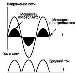 Импульсный источник напряжения потребляет мощность только в те моменты, когда напряжение, подаваемое с выпрямителя на сглаживающий конденсатор, выше напряжения на нем (конденсаторе), что происходит в течение примерно четверти периода. В остальное время источник не потребляет мощности из сети, так как нагрузка питается от конденсатора. Это приводит к тому, что мощность отбирается нагрузкой только на пике напряжения, потребляемый ток имеет форму короткого импульса и содержит набор гармонических составляющих (рисунок 1.7.а).