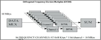 Широкополосные сигналы, получаемые мультиплексированием нескольких широкополосных сигналов с ортогональным частотным уплотнением (Оrthogonal Frequency Division Multiplex -- OFDM), представляют собой одновременную передачу на разных несущих частотах сигналов с фазовой модуляцией. Одним из ее преимуществ является высокая устойчивость к провалам в спектре, возникающим вследствие многолучевого затухания. Модуляция обеспечивает наименьшую интерференцию и спектр, весьма похожий на спектр "белого шума". Обработка OFDM обычно происходит с использованием быстрого преобразования Фурье (БПФ) и инверсного БПФ, что приводит к усложнению схем декодирования по сравнению с более простым типом модуляции.