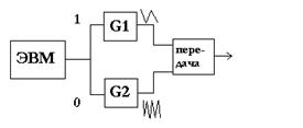 При передаче от ЭВМ цифрового кода генераторы G1 и G2, заполняют сигнал, синусоидами с разными частотами, соответ-ствующими "1" и "0", т.е. первоначальный сигнал моделируется.