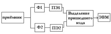 При приёме, полосовые фильтры Ф1 и Ф2 настроенные на полосы частот "1" и "0" формируют соответствующий цифровой код , крутые фронты которого создаются с помощью пороговых элементов ПЭ1 и ПЭ2. После чего происходит определение какой из кодов пришел и передача его в ЭВМ.