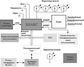 Приведем в пример устройство выпускаемое фирмой Analog Devices называемое SHARC EZ-Kit. Это устройство является универсальным комплексом по решению различных задач обработки сигналов, в том числе и задач кодирования и декодирования информации. На рис. 1.8 представленна блок-схема данного комплекса.