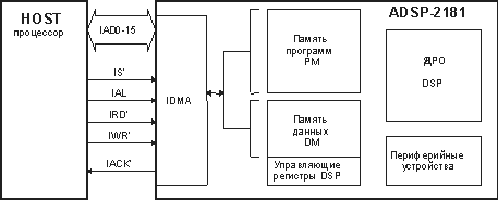 Порт прямого доступа к внутренней памяти (IDMA) процессора ADSP-2181 является одним из новых устройств, существенно упрощающих построение интерфейса с HOST-процессором.