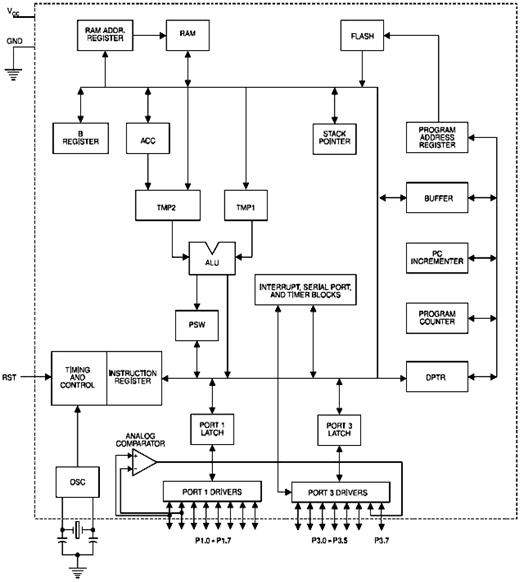 AT89C2051 разработан по технологии КМОП. Микроконтроллер оснащенный Flash программируемым и стираемым ПЗУ, а также совместим по системе команд и по выводам со стандартными приборами семейства MCS-51. Объем Flash ПЗУ - 2 Кбайта, ОЗУ - 128 байтов. Имеет 15 линий ввода/вывода, один 16-разрядный таймера/счетчика событий, полнодуплексный порт (UART) пять векторных двухуровневых прерываний, встроенный прецизионный аналоговый компаратор, встроенные генератор и схему формирования тактовой последовательности. Напряжение программирования Flash памяти - 12 В и ее содержимие может быть защищено от несанкционированных записи/считывания. Имеется возможность очистки Flash памяти за одну операцию и возможность считывания встроенного кода идентификации. Ток потребления в активном режиме на частоте 12 МГц не превышает 15 мА при 6 В и 5,5 мА при напряжении питания 3 В. В пассивном режиме (ЦПУ остановленно, но система прерываний, ОЗУ, таймер/счетчик событий и последовательный порт остаются активными) потребление не превышает 5 мА и 1мА. В стоповом режиме ток потребления не превышает 100 мкА и 20 мкА при напряжении питания 6 В и 3 В, соответственно. Микроконтроллер AT89C2051 ориентирован на использование в качестве встроенного управляющего контороллера.
