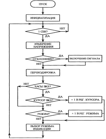 Алгоритм работы программы показан на рис. 4. После запуска и инициализации микроконтроллера программа переходит к распределителю, в котором каждую секунду последовательно измеряется напряжение, проверяются кнопки, и выполняется вывод на индикацию. Прерывание от этой последовательности происходит каждую секунду для подсчета времени в часах и таймере, если он включен.