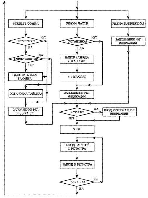 Если курсор в поле индикатора отсутствует, то обнуляется счетчик цикла записи, и первым импульсом выводится значение запятой для N-го разряда. В принципе, запятая в данном устройстве необходима только одна: для выделения десятых долей напряжения, тАФ однако подпрограмма вывода на индикацию универсальна, и потому нет смысла ее изменять. Значения запятых заранее записываются в позиционном коде в регистр запятой (т.е. если необходимо высветить запятую в пятом разряде индикатора, то записывают единицу в пятый разряд регистра). При этом необходимо помнить, что первыми в импульсной последовательности идут значения крайнего справа разряда.