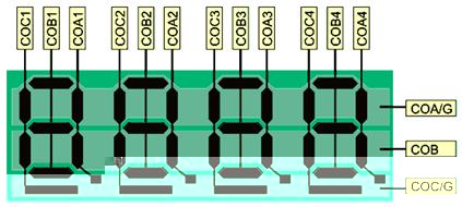 На рис. 7 показан пример конфигурации ЖКИ, а в таблице 2 показан порядок следования битов в кодовой посылке для этого варианта подключения такого ЖКИ.