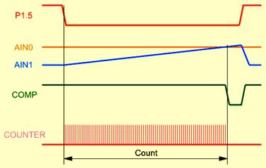 Для измерения напряжения бортовой сети построен простейший 8-разрядный АЦП на основе встроенного в микроконтроллер компаратора. Для уменьшения влияния помех используется 16-кратное усреднение результатов. Принцип работы АЦП пояснен на рис. 8.