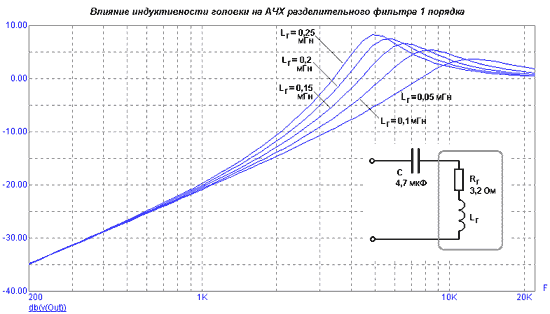 Видно, что даже при индуктивности 0,1 мГн имеется выраженный пик в области частот 7-10 кГц, придающий звучанию характерную "хрустальную" окраску. Увеличение индуктивности смещает резонансный пик в область более низких частот и увеличивает его добротность, что приводит к заметному "цыканью". Побочное следствие увеличение добротности, которое можно обратить на пользу - увеличение крутизны АЧХ. В области частоты раздела она близка к фильтрам 2 порядка, хотя на большом удалении возвращается к исходному для 1 порядка значению (6 дБ/октава).