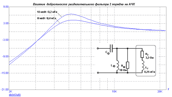 Однако все не так просто, как кажется на первый взгляд, и даже такая скромная индуктивность приводит к любопытным последствиям. Проблема заключена в том, что пищалки работают совместно с фильтром ВЧ. Независимо от порядка в нем имеется емкость, включенная последовательно с пищалкой, и она образует с индуктивностью звуковой катушки колебательный контур. Частота резонанса контура оказывается в полосе рабочих частот пищалки, и на АЧХ возникает "горб", величина которого зависит от добротности этого контура. В результате неизбежна окраска звучания. В последнее время появилась немало моделей пищалок высокой чувствительности (92 дБ и выше), индуктивность которых достигает 0,25 мГн. Поэтому вопрос согласования пищалки с пассивным кроссовером приобретает особую остроту.