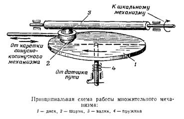 Множительный механизм предназначен для непрерывного умножения приращений пути AS на cos а и sin а. Он обычно выполняется в виде двух одинаковых фрикционов: один для определения Ах, второй тАУ Ау Электрический сигнал, поступающий от датчика пути, с помощью сельсина-датчика счетно-решающего устройства преобразуется в механическое вращение диска / с числом оборотов, пропорциональным пути, проходимому машиной. Это вращение передается на валик 3 посредством промежуточного шарика 2, заключенного в обойму, который изменяет свое положение на диске под воздействием линейного перемещения одной из кареток синусно-косинусного механизма. Скорость вращения валика прямо пропорциональна произведению скорости вращения диска на расстояние шарика от центра диска. А это расстояние для одного фрикционного механизма пропорционально синусу дирекционного угла машины, а для другого тАУ косинусу. Таким образом, угловая скорость вращения валика пропорциональна приращению соответствующей координаты.