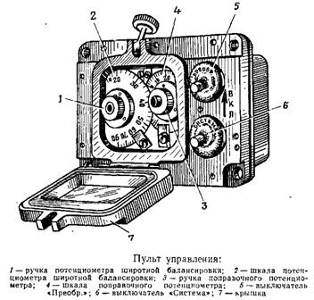 Для балансировки гироскопа на пульте управления имеются два потенциометра тАУ широтной балансировки и поправочной балансировки. Шкала широтного потенциометра проградуирована в градусах географической широты от 0 до 90В°. Шкала поправочного потенциометра проградуирована на 60 делений с оцифровкой через 10 делений.
