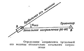 Выбирают на местности такую точку А, чтобы с нее хорошо был виден какой-либо удаленный ориентир В. Направление АВ принимают за начальное. Устанавливают машину на точке А, включают гирокурсоуказатель л определяют направление продольной оси машины относительно начального направления. Для этого с помощью визирного устройства машины измеряют угол авиз тАУ На шкале ВлКурсВ» устанавливают отсчет, равный оси: