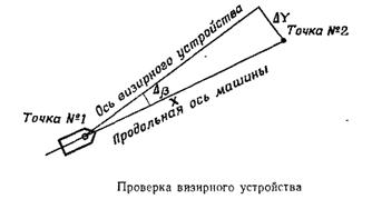 На ровной дороге выбирают прямолинейный участок длиной около 1000 м и выставляют вехи в его концах. На одной из этих точек устанавливают машину, запускают гироскоп и ставят нулевые отсчеты на шкалах х и у. С помощью визирного устройства определяют угол визирования на противоположную веху и вычисляют направление продольной оси машины аосн: