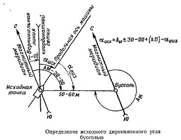 В том случае, когда в районе исходной точки нельзя выбрать ориентир, удаленный на 2тАУ3 км, а также при подготовке навигационной аппаратуры к работе ночью и в условиях ограниченной видимости, для определения исходного дирекционного угла используют буссоль, которая входит в комплект навигационной аппаратуры. Для этого буссоль устанавливают в 50тАУ60 м от машины и определяют магнитный азимут на центр визирного устройства. Чтобы получить дирекционный угол направления машина тАУ буссоль, измеренный азимут Ам изменяют на 30тАУ00 и вводят поправку направления П, взятую с карты. После этого по визирному устройству машины берут отсчет на буссоль, т.е. определяют авиз. Исходный дирекционный угол 30тАУ00 вводится в формулу со знаком +, если Ам меньше 30тАУ00, и со знаком тАУ, если больше. Учитывается также и знак поправки направления.