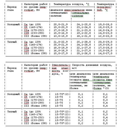 Допустимые величины показателей микроклимата на рабочих местах должны соответствовать значениям, приведенным в табл.2 применительно к выполнению работ различных категорий в холодный и теплый периоды года(ГОСТ 12.1.005-88).