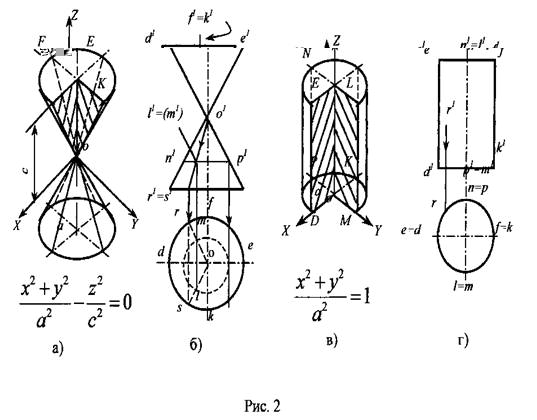 1. Конус образуют вращением прямой СЮ вокруг пересекающейся с ней оси Z(рис. 2, а). Координатные пл. ХОZи У0Z рассекают конус по пресекающимся прямым ОD, ОЕ, ОК и OF; пл. ХОYдает в сечении точку О; плоскость, параллельная пл. ХОY, пересекает по окружности (DFЕК).