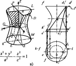 3. Однополостной гиперболоид образуют вращением прямой DЕ вокруг скрещивающейся с ней оси Z (рис. 3, а). Пл. ХОZ и YОZ пересекают его по гиперболам FК, LМ, РQ и RS, а пл. ХОY и ей параллельные - по окружностям (GU, FРLР и КQМS). При вращении точек D и Е их проекции d и е перемещаются по окружности, и проекции d' и е' - по прямым, параллельным оси X. Точка U прямой DЕ, ближе других расположенная к оси вращения, описывает окружность UU1 наименьшего диаметра. Эту окружность называют гордом поверхности. Лучи, проектирующие какую-либо поверхность, касаются ее в точках, образующих контурную линию. Соответствующая проекция этой линии называется очерком поверхности. Очерком однополостного гиперболоида на пл. V служат две ветви гиперболы, вершины которой лежат на горле поверхности. Следовательно, эту поверхность можно образовать вращением гиперболы вокруг ее мнимой оси.