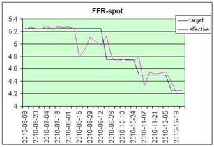 1. ставка по федеральным фондам и учетная ставка ФРС. В США ставка по федеральным фондам является той ставкой, по которой банки кредитуют друг друга тАУ одалживают свои резервы, хранящиеся на счетах ФРС. Средневзвешенная ставка по кредитным сделкам, заключенным в ходе дневной торговли, называется Влэффективной ставкойВ». Федеральная Комиссия по открытым рынкам устанавливает целевую ставку по федеральным фондам, которую еще называют Влноминальной ставкойВ». Когда в новостях сообщается об изменении ставки, почти всегда имеется в виду именно номинальная ставка по федеральным фондам, а не учетная ставка, как пишут. В реальной жизни номинальная ставка может наблюдаться только случайно, когда совпадет с эффективной или в отдельных межбанковских сделках. Она служит в качестве цели, в диапазоне вокруг которой происходит торговля резервами. На графике внизу это хорошо видно.