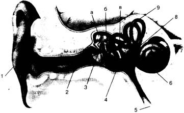 Рис. 1. Строение уха и вестибулярного аппарата. Наружное ухо: 1 тАФ ушная раковина; 2 тАФ слуховой проход; 3 тАФ барабанная перепонка. Среднее ухо: 4 тАФ полость среднего уха; 5 тАФ слуховая трщба; косточки среднего уха: молоточек (а), наковальня (б), стремечко (в); внутреннее ухо: 6 тАФ улитка; 7 тАФ слуховой нерв. Вестибулярный аппарат: 8 тАФ преддверие с мешочками; 9 тАФ полукружные каналы