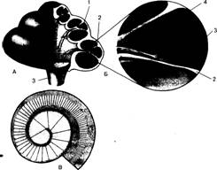 А тАФ вскрытая улитка: 1 тАФ положение спирального органа в улитке; 2 тАФ основная мембрана; 3 тАФ слуховой нерв; Б тАФ спиральный орган: 2 тАФ основная мембрана; 3 тАФ волосковые клетки (рецепторы слуха); 4 тАФ покровная пластинка; В тАФ основная мембрана, состоящая из волокон разной длины и толщины, несущих волосковые клетки (вид сверху) и способных отзываться на звуки разной высоты. Деформация волосков клеток (3) при колебании основной мембраны вызывает возбуждение слуховых рецепторов