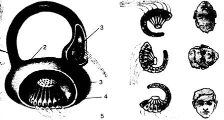 Рис. 4 Строение и функции вестибулярного аппарата: полукружный канал; 2 тАФ мешочек; 3 тАФ известковые кристал-Mlku4 тАФ волосковые клетки; 5 тАФ нервные волокна; 6 справа тАФ изменения в органах равновесия при разном положении головы