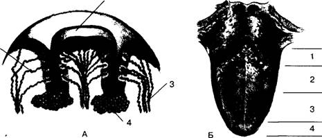 Рис. 7. А тАФ строение вкусового сосочка: 1 тАФ вкусовые рецепторы; 2 тАФ вкусовой сосочек; 3 тАФ вкусовые нервы; 4 тАФ железы, секреты которых отмывают сосочек от воздействовавших на него веществ; Б тАФ вкусовые зоны языка и ощущения, возникающие при их раздражении: 1 тАФ горькое; 2 тАФ кислое; 3 тАФ сотеное; 4 тАФ сладкое