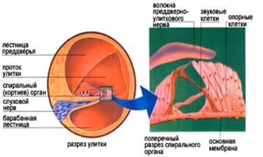Продольные колебания воздуха, несущие звук, вызывают механические колебания барабанной перепонки. С помощью слуховых косточек оно передается перепонке овального окна, а через нее тАФ жидкости внутреннего уха (рис. 1). Эти колебания вызывают раздражение рецепторов спирального органа (рис. 2), возникающие возбуждения поступают в слуховую зону коры большого мозга и здесь формируются в слуховые ощущения.