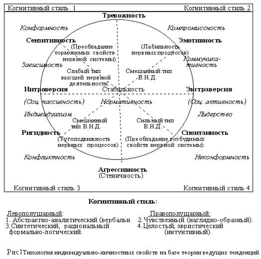 ВлПсиходиагностика представляет собой наиболее формализованный объективный метод изучения индивидуально-личностных свойств. Ее применение, в том числе в виде компьютерных версий, оказывает значительную помощь практическим психологам множества организаций. Однако неразборчивое применение тестов, не адаптированных к отечественным условиям, обладающих низкой валидностью, не объединенных общей теоретической концепцией может принести вред. Применяя психодиагностические методики, исследователь должен иметь представление об изучаемом объекте, то есть опираться на определенную концептуальную модель личности. Долгое время отговоркой в этих случаях служило отсутствие общепринятого концептуального подхода не только в методологии психодиагностического исследования, но и в расшифровке самого понятия "личность". Теория деятельности, являясь фундаментальным учением в сфере общей психологии, не дает ключа к пониманию проблем и индивидуально-личностных свойств конкретного человека. На базе многолетних исследований, сопряженных как с адаптацией известных зарубежных тестов, так и с созданием собственных оригинальных методик, нами разработана методология психодиагностического исследования. Ее основой является парадигма преемственности разных уровней поэтапного развития и формирования личности и целостное понимание личности как единства биологического, психологического и социального факторов (Амосов П.К., Ананьев Б.Г., Выготский Л.С., Рубинштейн С.Л., [12]). Теория ведущих тенденций - концепция целостного подхода к личности как единства биологического, психологического и социального факторов. С этих позиций формирование личности тесно связано с врожденными индивидными свойствами. На основании данного подхода разработана индивидуально-личностная типологии. Каждое типологическое свойство представляет собой одну из базовых тенденций, которая пронизывает психологическую сущность человека от генетической предиспозиции - через конституциональные особенности и характер до уровня сформированной личности. Изучение ранее созданных типологий (Э.Кречмер, К.Шнайдер, Г.Айзенк, У.Шелдон [12]) обнаружило ряд методологических ошибок и категориальную нечеткость. Предлагаемая нами типология индивидуально-личностных свойств представлена восемью основными тенденциями. Среди них традиционны интроверсия и экстраверсия, новыми являются противопоставленные друг другу в ортогональной схеме такие полярные свойства как тревожность (нерешительность, интрапунитивность) - агрессивность (стеничность, экстрапунити-вность), сензитивность (чувствительность и податливость средовым воздействиям) - спонтанность (непосредственность поведения и противодействие влиянию окружающей среды), лабильность (изменчивость, гибкость) - ригидность (устойчивость, инертность).