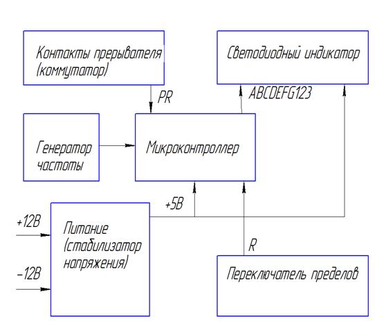 Схема электрическая структурная содержит: микроконтроллер, контакты прерывателя, переключатель пределов, светодиодный индикатор, генератор тактовой частоты и источник питания.
