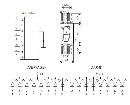 АЛ304Г: 1 тАУ катод e; 2 тАУ катод d; 3, 8 тАУ анод общий; 4 тАУ катод c; 5 тАУ катод h; 6 тАУкатод b; 7 тАУ катод a; 9 тАУ катод g; 10 тАУ катод f.