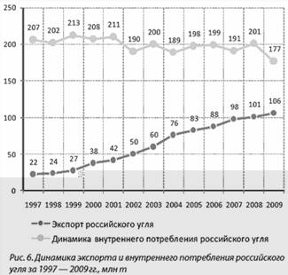Динамика экспорта и внутреннего потребления российского угля