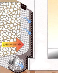 Дренаж дождевой воды необходим даже в случае обеспечения полной гидроизоляции наружных стен. При наличии грунтовых вод фундаментная плита и наружные стены, расположенные ниже уровня земли, должны быть полностью защищены с помощью оклеечной гидроизоляции. При этом необходимо обеспечить защиту также и самой гидроизоляции, дренаж избыточной влаги и снижение давления на стены, так как в таких случаях нагрузка на поверхность может превышать обычные показатели в два раза.