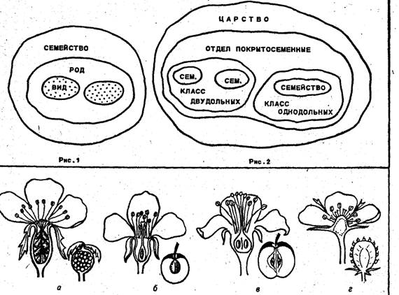 Формируя понятия ВлродВ» и ВлсемействоВ», учитель рассказывает, что растения близкородственных видов объединяются в роды. Например, виды яблоня домашняя, яблоня китайская, яблоня мелкоплодная тАФ близкородственны. Но как ни сходно строение этих видов яблонь, можно найти и черты отличия. Это размеры и окраска цветков, плодов, сроки цветения и созревания плодов и т. п. Поэтому их нельзя отнести к одному виду. Однако большое число общих признаков, свидетельствующих о родстве, позволяет объединить их в один род тАФ Яблоня. Род яблони вместе с близкородственным ему родом груши объединяют в семейство Розоцветные семейство тАФ крупная) систематическая группа, объединяющая сходные по происхождению роды. Семейство Розоцветные с другими близкородственными ему семействами относят к классу двудольных растений.